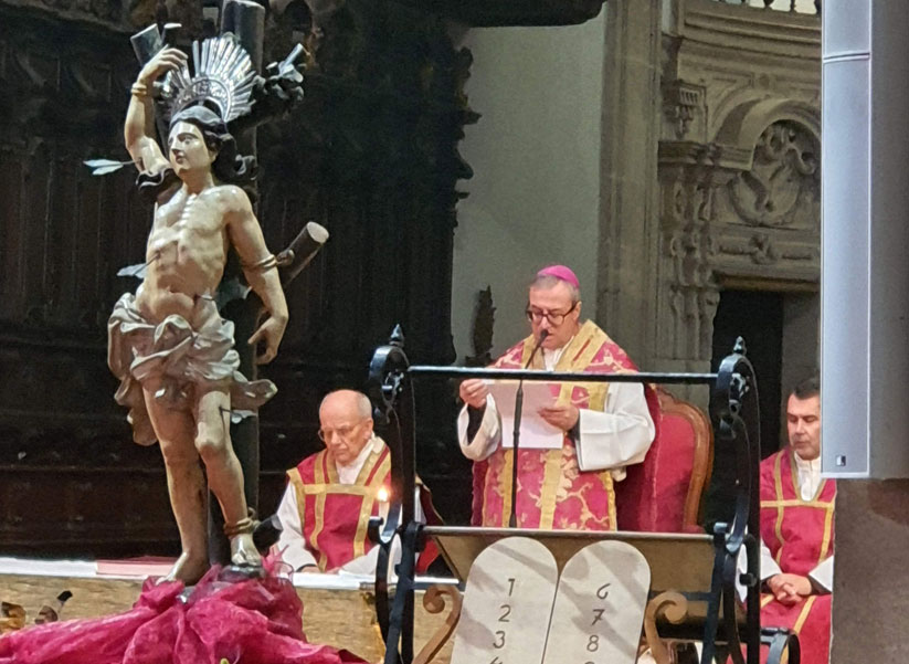 2. No meio da cidade pestilenta e decadente, São Sebastião representa uma fonte de vida. Há a cidade dormente e sonolenta. E há, em contraponto, a cidade alumiada e atenta, que não se pode esconder sobre um monte. Não se pode apagar o horizonte. Não se acende uma LUZ para a colocar debaixo da ponte. De qualquer lugar se via, em qualquer lugar se via, que Sebastião trazia Cristo a arder no coração. Não o escondia. Por isso, o imperador romano, Diocleciano, quis fazer desaparecer este soldado de Cristo. Por isso, o fez morrer na grande perseguição que desencadeou contra os cristãos nos primeiros anos do século IV. O tirano, Diocleciano, fez o que podia fazer. Mas era pouco e tarde demais. Mandou quebrar o frasco cheio de perfume. Mas não se apercebeu que, ao quebrar-se o frasco, se soltaria o perfume, que nem o estrume de Roma podia apagar. E foi assim que o perfume intenso daquele amor imenso se espalhou por Roma e pelo mundo inteiro. Já sabemos que chegou também a Lamego esse cheiro intenso e perfumado, que sanava a fome, a peste e a guerra, mas também o frio, e sobretudo o vazio do coração e da alma, a descrença e a indiferença, a maior doença que corrói a sociedade.